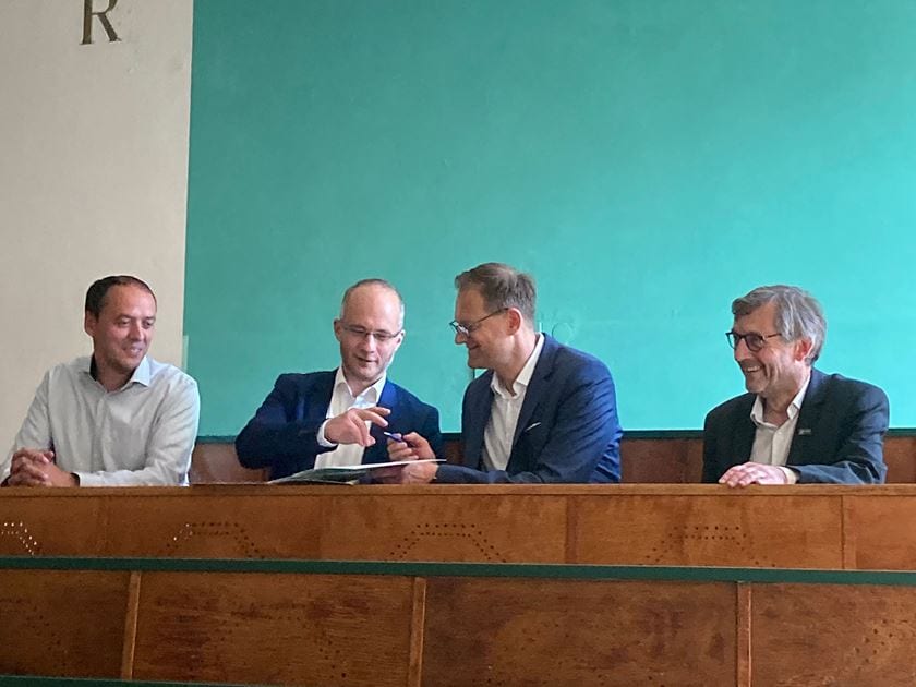 Prof. Dr.-Ing. Timo Mappes, Gründungsdirektor des D.O.M. und Dr. Stefan Traeger, Vorstandsvorsitzender der JENOPTIK AG, besiegelten die Absicht am heutigen Freitag unter Beisein von Prof. Dr. Rosenthal, Präsident der Friedrich-Schiller-Universität Jena und Vorsitzender des Kuratoriums der Stiftung D.O.M., sowie Christian Gerlitz, Bürgermeister und Dezernent für Stadtentwicklung und Umwelt der Stadt Jena sowie Mitglied im Kuratorium der Stiftung D.O.M.
