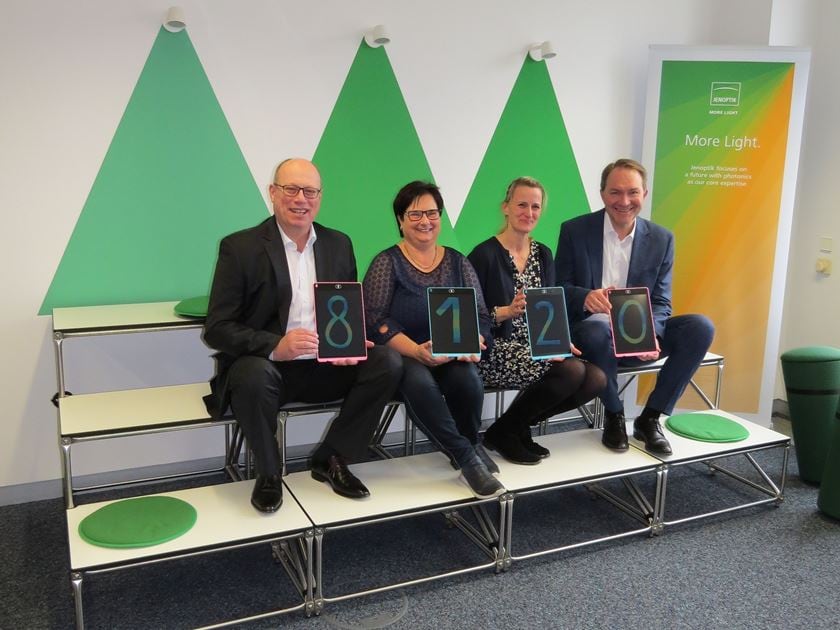 Im Bild von links: Finanzvorstand Hans-Dieter Schumacher, EKK-Geschäftsführerin Katrin Mohrholz, Jenoptik-Markting-Mitarbeiterin Annekatrin Gebhardt, Vorstandsmitglied Ralf Kuschnereit.
