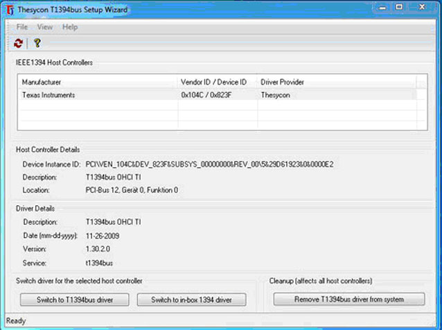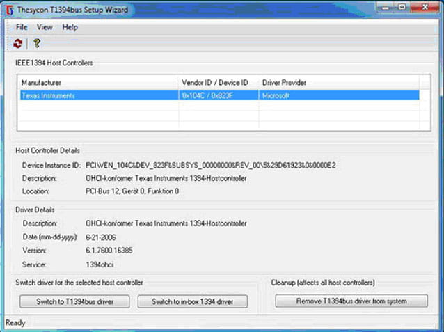 2. Bitte wählen Sie den host controller den Sie aktualisieren möchten und klicken Sie den Button “switch to T1394bus driver" um den Bustreiber zu installieren.